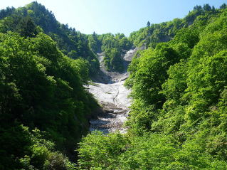 トチ、サワグルミ、ホウなどの大木が緑いっぱい葉を広げている中を、春ゼミの声を聞きながら沢沿いを歩きました。