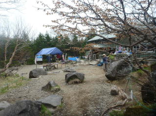 蓼科山荘の前にはテントを張った売店がありオリジナルTシャツ、バッチ、手ぬぐい等を販売していた。 |
