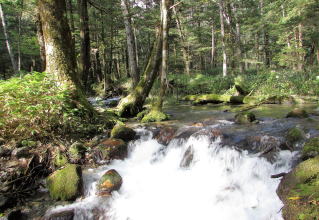 明神池を後に梓川右岸の苔むした渓流沿いを、河童橋、ウエストン碑を経て帝国ホテルへ。