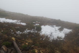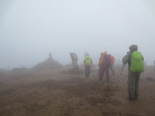 霧の中で記念写真を撮ってそそくさと下山開始です。30分以上の遅れもあります。