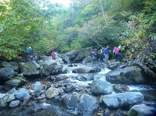いくつかの小沢を越えると2回目の渡渉が待っていた。渡渉後ここで小休止し水分やエネルギーを補充。 |