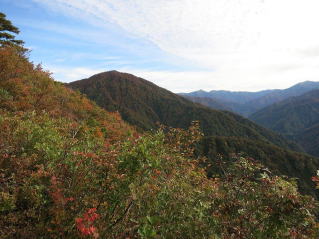 やっとの思いでピークに辿り着くも誰もいなく静かだ。360度の素晴らしい展望が開け、眼前の斜面に目をやると赤、黄、橙、緑が織りなす錦繍に大興奮。感嘆の声が一斉にあがり急に賑やかになる。「錦秋の候、こんな素晴らしい紅葉が観られるなんて最高。頑張った甲斐があった。気分も高揚してくるわ」には座布団十枚の声が飛ぶ。 |