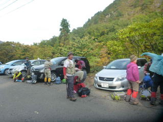 リーダーからは渡渉、へつりの箇所があるので、十分気を付けての歩行。ストックのキャップを外した方がよいことなどの注意事項を聞きながら登山口に到着です。