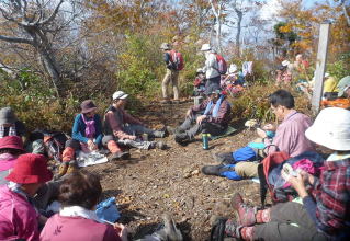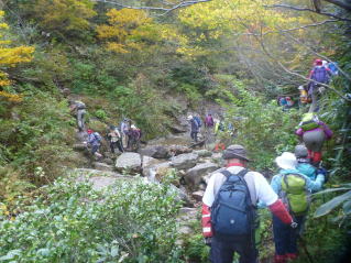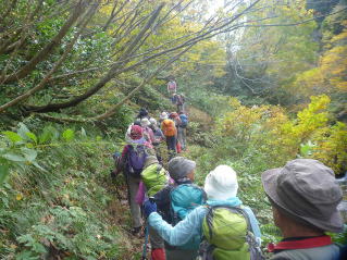 ロープと鉄杭のある岩場です。足の置き場を確認し皆なで声を掛け合いながら慎重に足を運びます。無事に乗り越えホットしつつも、まだまだ、木々の中を歩くなかなかの急登が続きます。 |