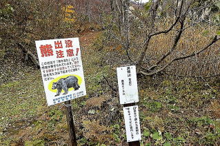 事前調査でも、ふもとのお店のおばさんも「クマに気を付けて」と言われ、登山口でも大きな熊注意看板となればクマ除けの鈴や笛を鳴らし続けながら登っていった。