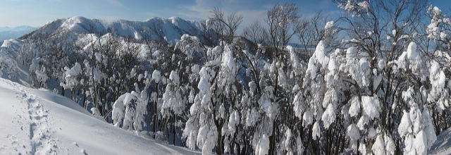 雪の重さに耐え続ける樹々達の奥に菱ケ岳 |