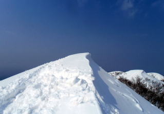 三ノ峰の小屋は雪に埋もれドアが半分だけ出ていた。天気が良いので小屋に入らず先に進む。