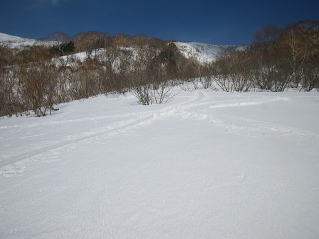 今年は本当に雪が少ないです。こんなにブッシュが出ていてはスムースに歩けません。 |