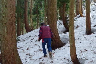 尾根に出て杉林の中は歩き辛いので斜面沿いに杉林の横を歩く事を勧められました。