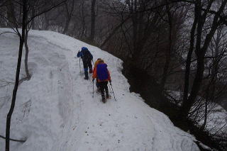 新津を出る頃は曇りでしたが遅場集落の除雪終点に着くと霧雨が少し降って居ましたが余り濡れる事も無いと思いワカンなどを着け支度をしていると集落のお父さんが軽トラで来て猿ヶ城に登る安全で楽に登れる道を教えて貰い又お父さん自身もワカンを着けて登り口まで案内して貰いました。 |
