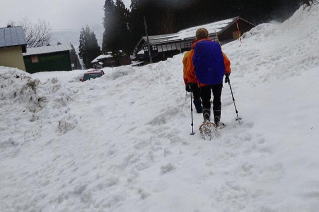 急斜面を慎重に下り用水路を越えて水路沿いの車道の雪の上を歩き無事に車の有る除雪終点に着きました。