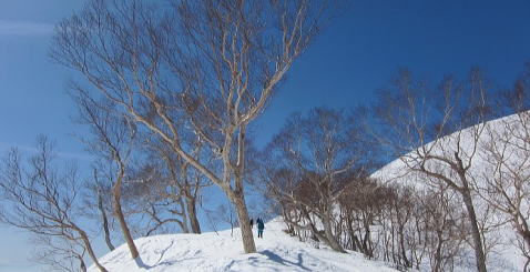 青空と太陽が身も心も軽くさせ、締まった雪面を晴れやかな気分で歩く、しかし、丸山ケルンまでの3つの急坂でぺースが大きく落ちる。