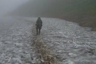 小屋手前の登山道を雪渓が塞ぎ横切るには危険と判断雪渓の横を途中腰位までの笹藪を分けて歩き三国岳からの縦走路に出て切合小屋に着きました。