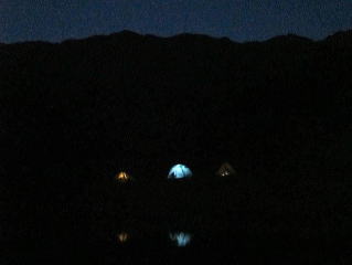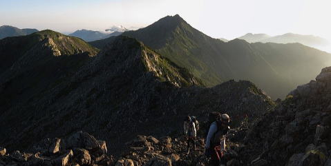 白みかけた空に黒くて大きい北岳が浮かび上がり、登山者のヘッドランプだけが蛍のように輝く。