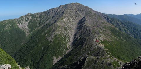 | 西農鳥岳から間ノ岳を望む、赤い屋根は農鳥小屋 |