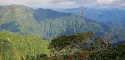 北側には清太岩山①と障子ヶ岳② |