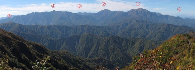今年4月の会山行で登った日向倉山から見た未丈ヶ岳、今はその未丈ヶ岳から日向倉山を俯瞰していると思うと感慨深い。