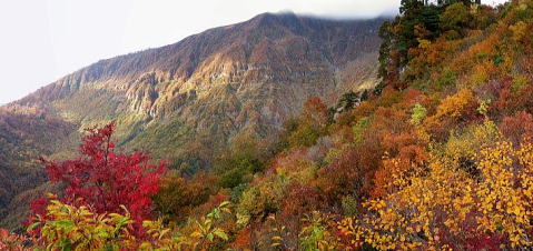 | 鬼が面眺メから浅草岳を望む、山肌を覆う紅葉が美しい |