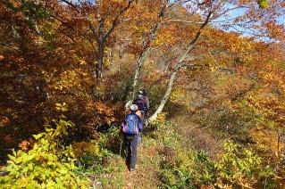 途中の尾根からは眼下にゴルフ場が見えます。又登山道からは紅葉した木も少しは見られます。