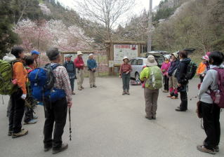 大沢公園では手順よく登山準備を済ませ、M研修部長の挨拶の後、桜が咲き誇る大沢公園を横切り、いきなりの急斜面でスタート。 |