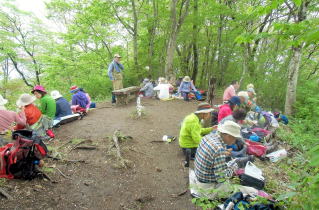 昼食後、全員で記念写真を撮り、後半戦(下山ではない)に向け美しい新緑の中へ出発。 |