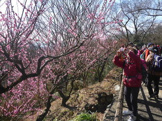 一旦、白衣大観音まで戻り染料植物園へ向かいます。道中、満開の紅梅や、早咲きの桜に一足早い春を楽しみました。