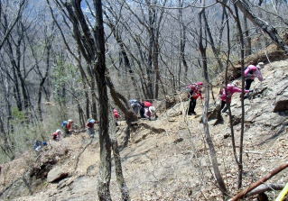 「ここはみんなで男坂を登りましょう」と全員が男坂アタック、木々の枝、岩を掴みながら一気に高度を稼ぐ。