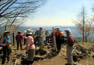 山頂からの大展望を楽しみながら、殆ど風も無く暖かい陽射しを浴びて昼食休憩となった。(春霞で東京スカイツリーは観えなかった)