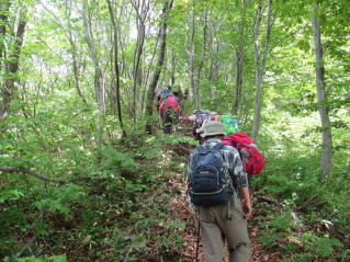 青葉若葉のトンネルを慎重に下山。途中休憩にストレッチ体操を。 |