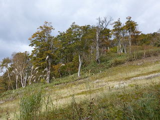 ゲレンデにぶつかると少し山道らしくなりました。ここまで来ると色付いたブナの葉が陽に輝いています。