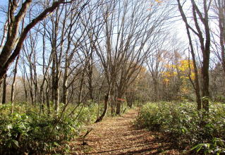 “ささやきの小径”は、トチノキ、ミズナラ、シナノキ、カラマツ等の木々が幾重にも層を作るように生育しており、広葉樹の林を歩くと落ち葉がサクサクを音を立て、カラマツ林に入ると絨毯の上を歩くような感じが足に伝わってくる。