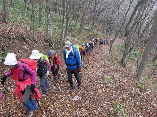 この十字路を過ぎると、道は幾分狭くなり勾配もややキツクなって、いよいよ登山という感じとなります。ここからは体制を整えて、班編成の順番で登ります。
