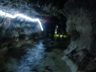 部分的に薄い照明はありましたが、大部分は真っ暗闇。冷たい清水の流れの中を腰を屈めて歩きます。 |