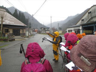 「地図と山行行程」と「コンパスの操作方法」の説明を受ける。地図には〒、寺、駅、石碑、〜記号などで現在地確認に重要との事でした。