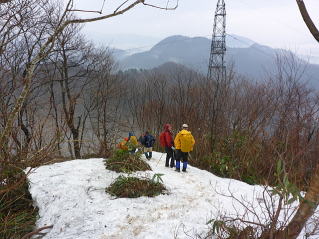 Yリーダーが頂上へはこの先標100M位登りますが、雨と残雪の為ここで中止にしましょう、と下山になりました。