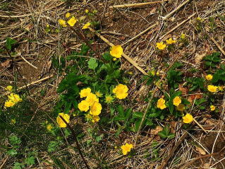 | 12時で一区切りつけお昼にしましょう。風の当たらない笹薮に陣取りました。雪割草やカタクリの花もあちこち咲いていました。 |
