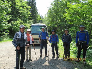 Кリーダーさんから朝のご挨拶とコース説明がありました。去年は通行止めがあり迂回せざるを得なく遅くなったとのこと。今年は問合わせたら真っすぐ登山口までバスで行けるとの事、これまたラッキー! 緑の渓谷沿いを走って道の駅「おぐに」でトイレ休憩をとり、予定通り「大日杉小屋」に到着。