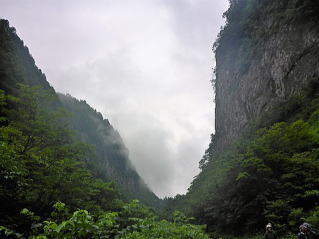 U字谷状の岩壁が高くそびえてくると、マイコミ平の入り口「浄土門」です。あの世とこの世の境、これを歩いて超えると別天地になります。