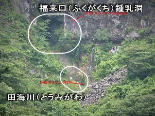 マイコミ平で吸い込まれた水は、約3.5km下流の福来口(ふくがくち)鍾乳洞で再び流れ出て、田海川(とうみがわ)となって日本海に注ぎます。 |