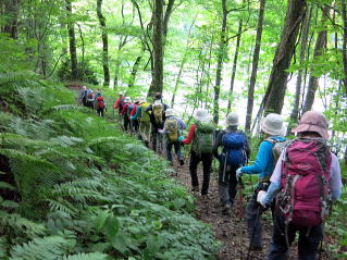 急坂を登った先の蟶山は、白神山地の中でも格別見事なブナ林が連続し、吸い込まれそうな緑が疲れた足を励ましてくれます。