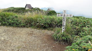20分ほどの稜線歩きを楽しんだ先に山頂です。メルヘンチックな避難小屋とトイレ棟の先、少し小高い丘に三角点と標識の建つ山頂広場です。 世界遺産決定の条件として、トイレ棟が出来たとか・・・。 |