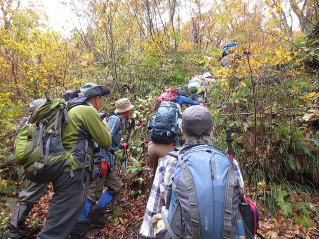 その後、倒木を跨いだり、くぐったり、見事な黄葉の樹林帯の中を進んでいきます。