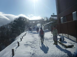 いつもは風が強く、雪が降っているなどで参拝したら早々に下山したが、今日は穏やかに晴れているので、ゆったりとした気持ちになり、ゆっくりと参拝、下界の景色を見る余裕が出る。 |