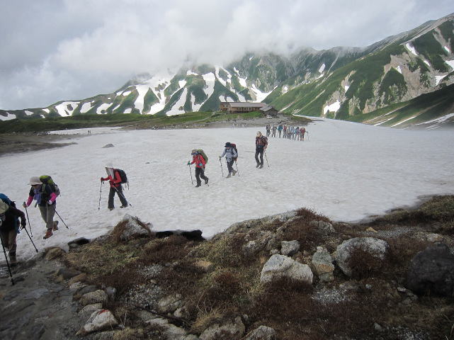 夏だというのに寒ささえ感じる2400Mの高地、うっすらとガスがかかっていたがなんとか周りの景色も望めた。残雪がまだら模様の立山の山々、一ノ越山荘はあそこだと説明。 |