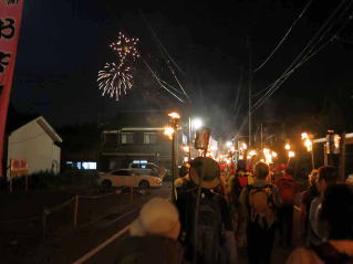 | 松明を持って下山。暗闇での松明の明かりが幻想的です。 |