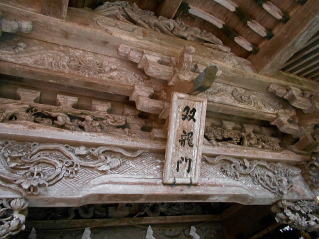 やがて「三重の塔」、日曜日のせいか結構な人出でした。その脇には「行者渓」があり大きな岩に囲まれ、いまにも落ちてきそうで怖くなります。その先、階段を30段程進むと見事な双龍の彫刻が所狭しと掘られた「双龍門」があり、又更に階段30段程進と神楽殿、本殿の榛名神社到着しました。 |