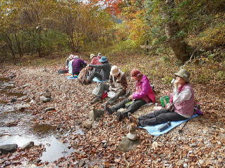 昼食はお弁当持参の方は砂防堰堤上流の川原で日向ぼっこのランチタイムです。門前でお蕎麦を食べる方とは二つに分かれました。