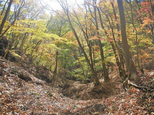 緩やかなアップダウンの杉林を一時間程歩くとやっと明るいもみじ谷に到着。