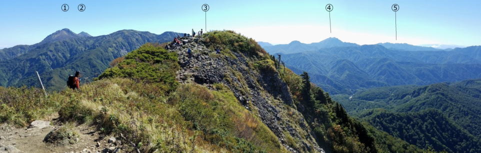 北側に日本海と二年前の会山行で歩いた海谷山塊(駒ヶ岳、鬼ヶ面山、鋸岳)