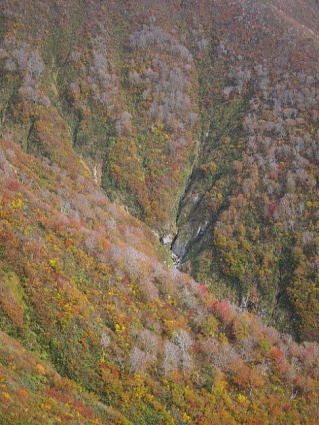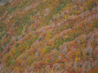 西朝日岳から南西に伸びる尾根のようだが、紅葉は全然ぱっとしない、「真っ赤に染まる」って、これのこと、じゃないよね。